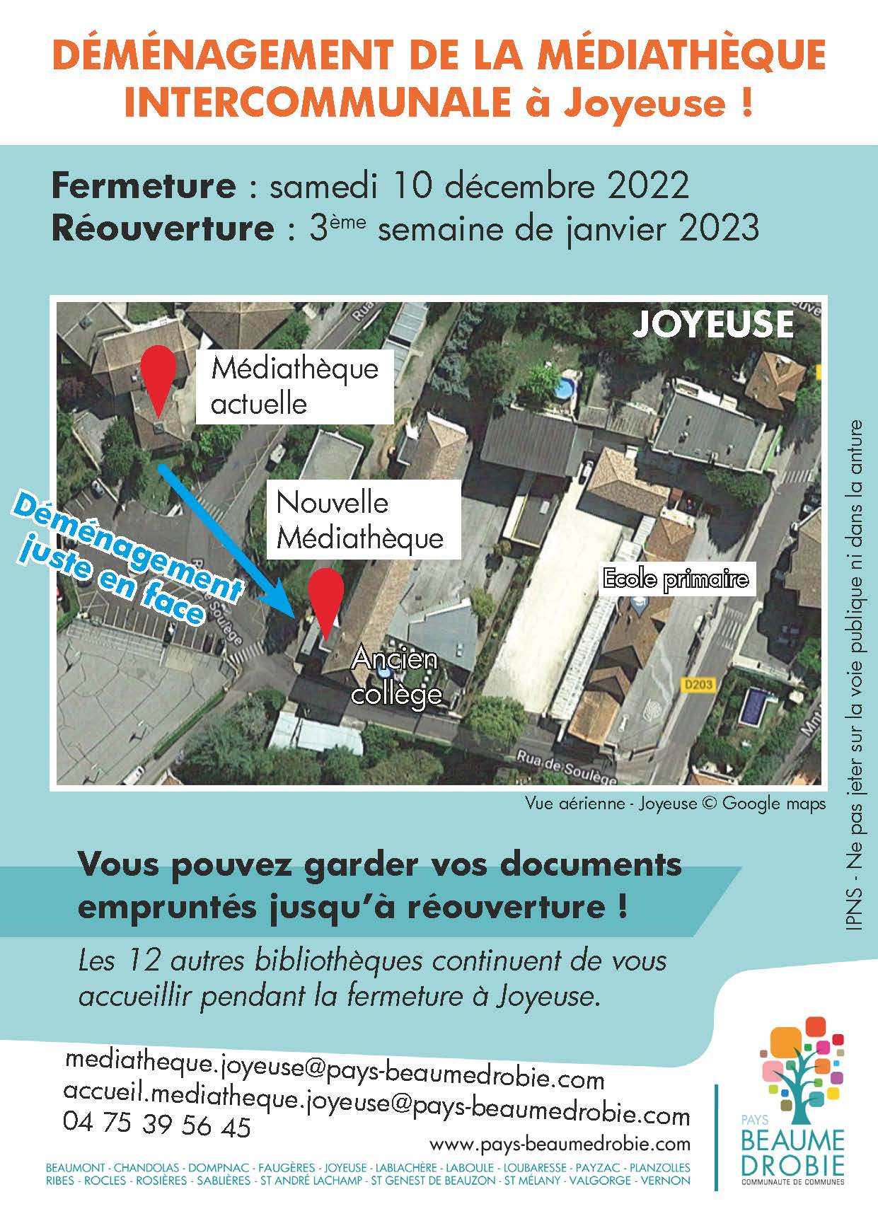 BEAUME-DROBIE : LA MEDIATHÈQUE DE JOYEUSE DÉMÉNAGE Obtenir le lien Facebook X Pinterest E-mail Autres applications novembre 23, 2022 La Médiathèque intercommunale à Joyeuse sera fermée à partir du 10 décembre jusqu’à la 3ème semaine de janvier 2023 pour cause de déménagement ! Obtenir le lien Facebook X Pinterest E-mail Autres applications